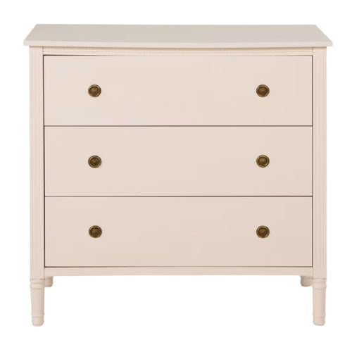 Commode en bois beige à trois tiroirs avec poignées en métal.